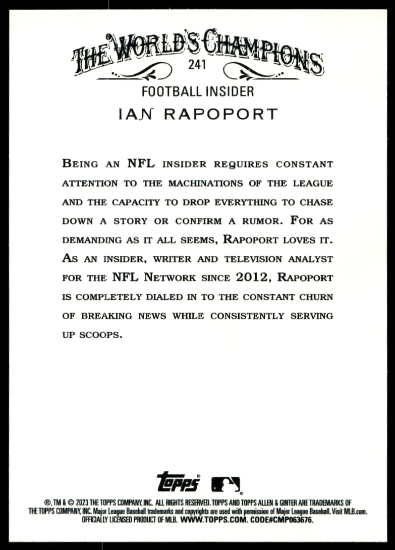 This Baseball card, from 2023 is part of the Topps Allen & Ginter card set. Ian Rapoport is featured and has a card number of 241.