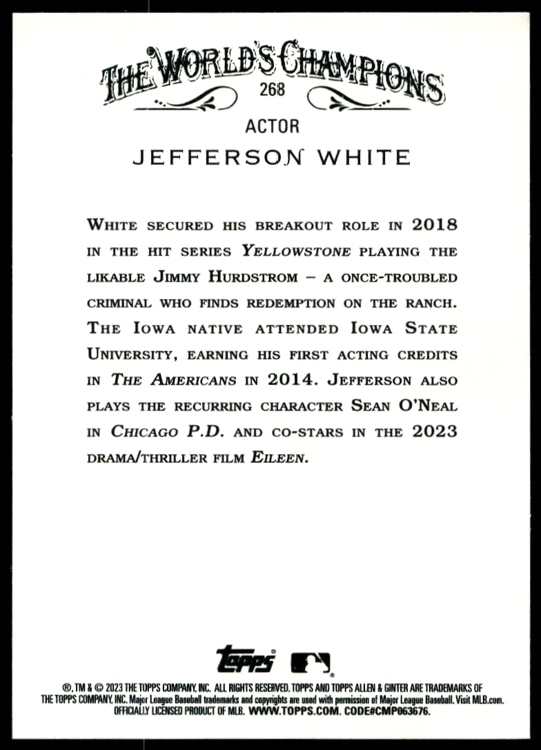 This Baseball card, from 2023 is part of the Topps Allen & Ginter card set. Jefferson White is featured and has a card number of 268.