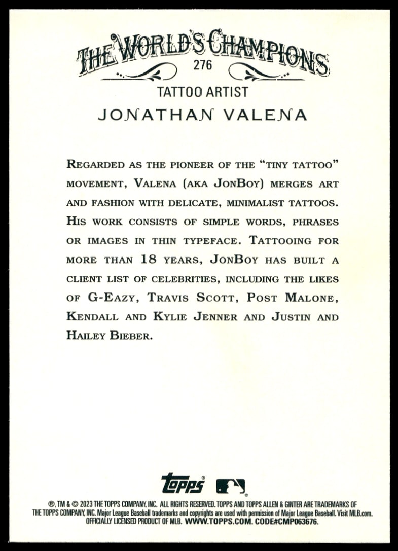 This Baseball card, from 2023 is part of the Topps Allen & Ginter card set. Jonathan Valena is featured and has a card number of 276.