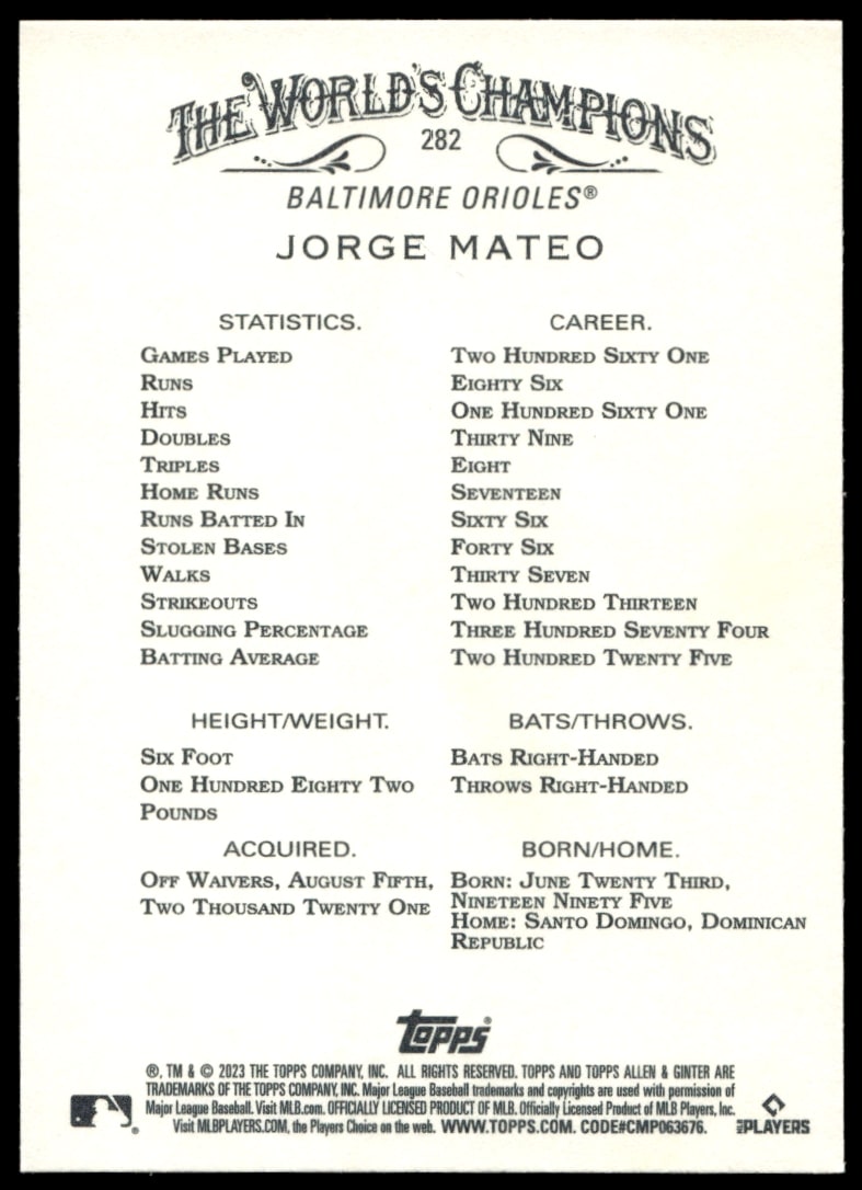 This Baseball card, from 2023 is part of the Topps Allen & Ginter card set. Jorge Mateo is featured and has a card number of 282.