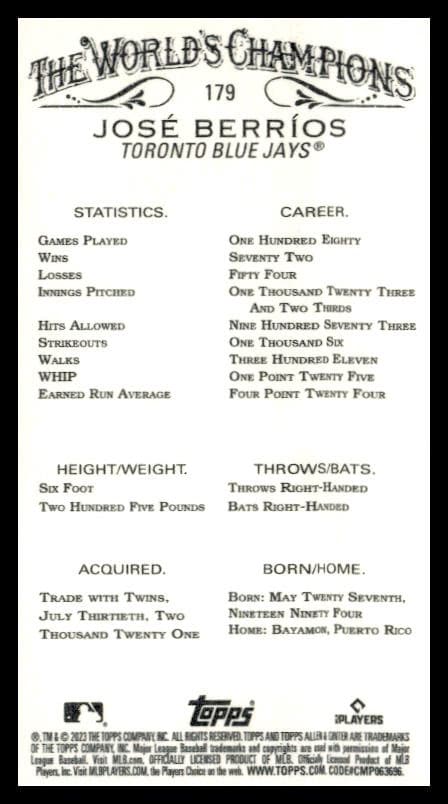 This Baseball card, from 2023 is part of the Topps Allen & Ginter card set. Jose Berrios is featured and has a card number of 179.