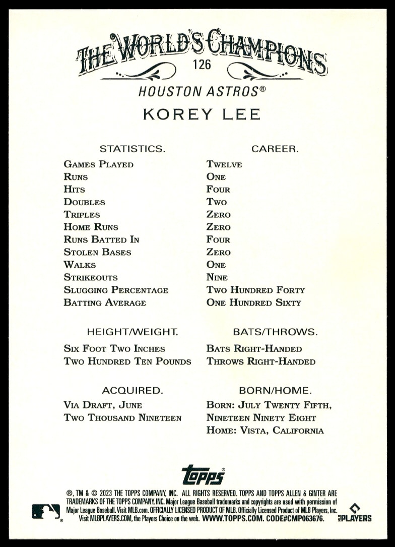This Baseball card, from 2023 is part of the Topps Allen & Ginter card set. Korey Lee is featured and has a card number of 126.