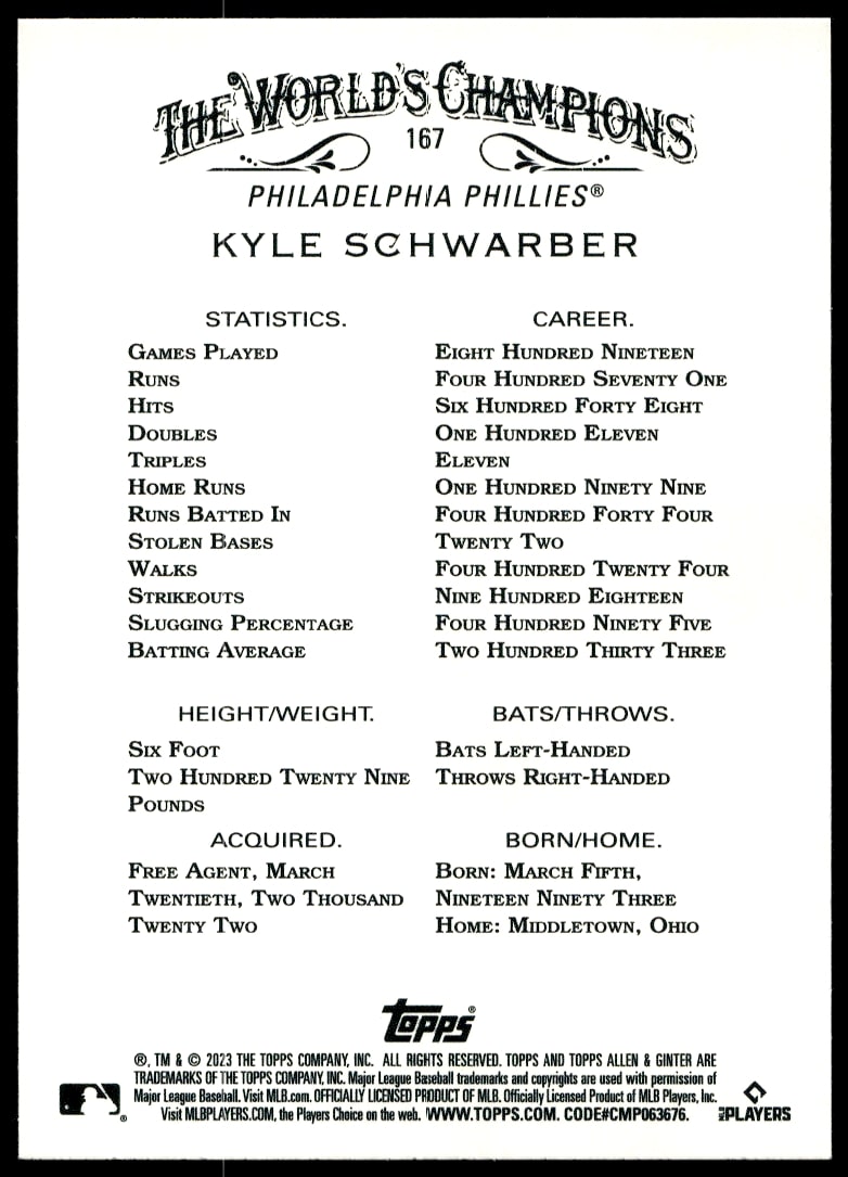 This BaseballΒ card, from 2023 is part of the Topps Allen & GinterΒ card set. Kyle Schwarber is featured and has a card number of 167.