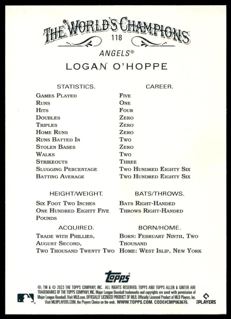 This BaseballΒ card, from 2023 is part of the Topps Allen & GinterΒ card set. Logan O’Hoppe is featured and has a card number of 118.