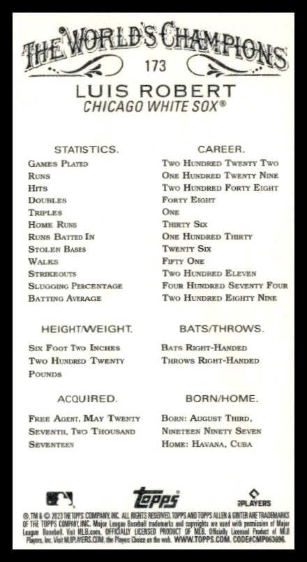This Baseball card, from 2023 is part of the Topps Allen & Ginter card set. Luis Robert is featured and has a card number of 173.