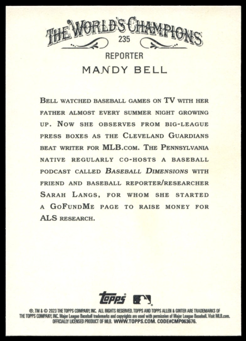 This Baseball card, from 2023 is part of the Topps Allen & Ginter card set. Mandy Bell is featured and has a card number of 235.