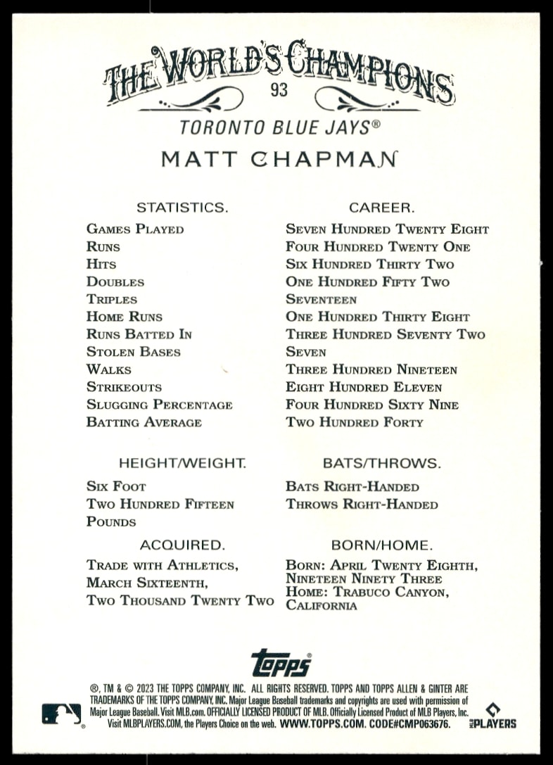 This Baseball card, from 2023 is part of the Topps Allen & Ginter card set. Matt Chapman is featured and has a card number of 93.