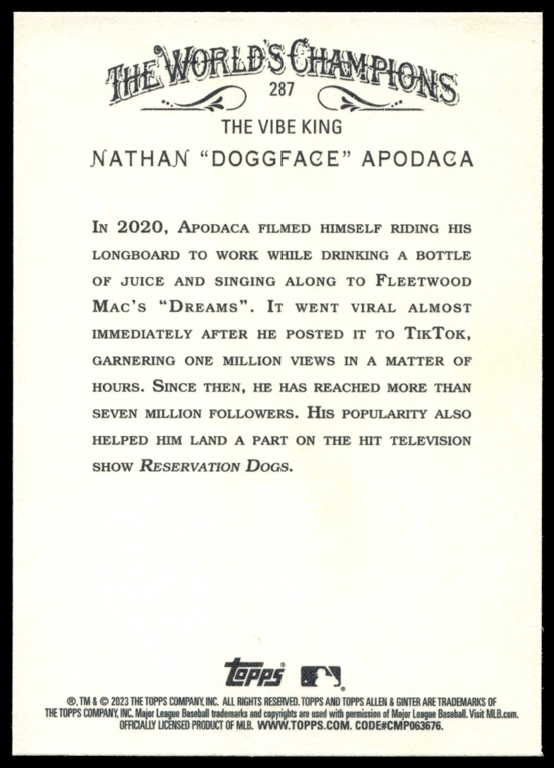 This Baseball card, from 2023 is part of the Topps Allen & Ginter card set. Nathan “Doggface” Apodaca is featured and has a card number of 287.