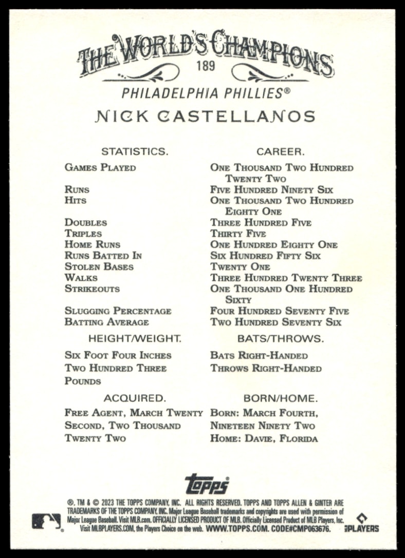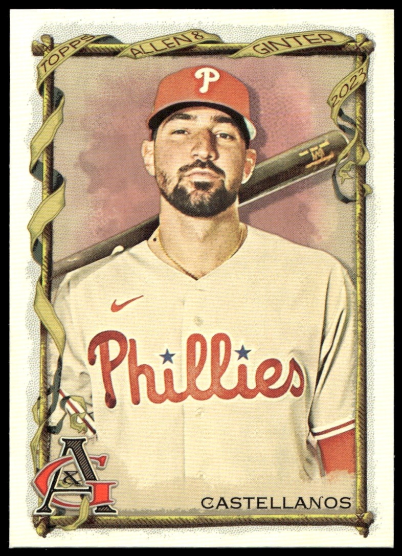 This Baseball card, from 2023 is part of the Topps Allen & Ginter card set. Nick Castellanos is featured and has a card number of 189.