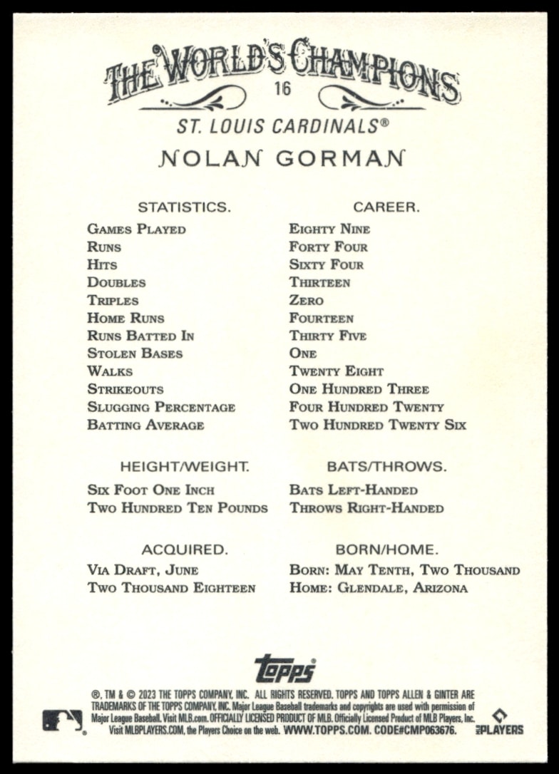 This Baseball card, from 2023 is part of the Topps Allen & Ginter card set. Nolan Gorman is featured and has a card number of 16.