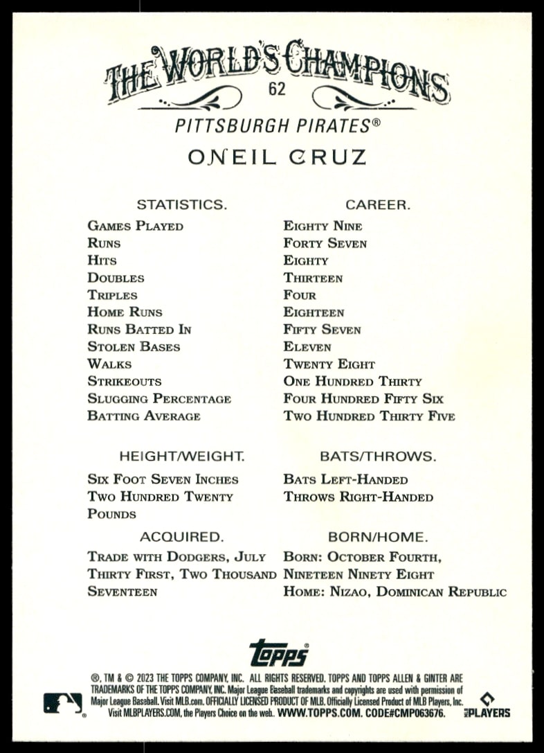 This Baseball card, from 2023 is part of the Topps Allen & Ginter card set. Oneil Cruz is featured and has a card number of 62.