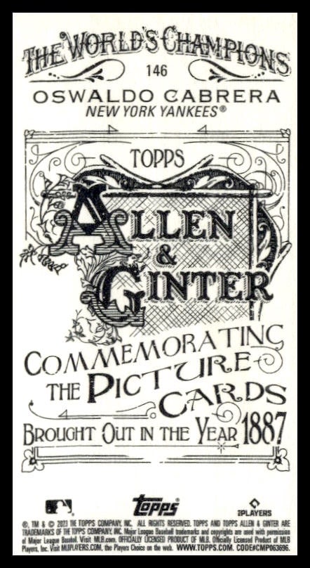 This Baseball card, from 2023 is part of the Topps Allen & Ginter card set. Oswaldo Cabrera is featured and has a card number of 146.