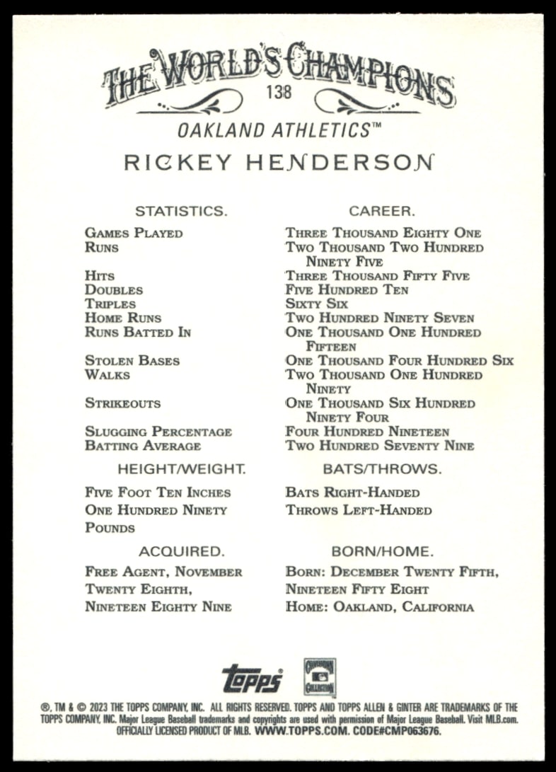 This BaseballΒ card, from 2023 is part of the Topps Allen & GinterΒ card set. Rickey Henderson is featured and has a card number of 138.