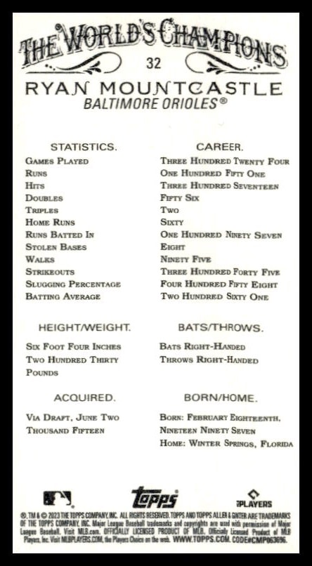 This Baseball card, from 2023 is part of the Topps Allen & Ginter card set. Ryan Mountcastle is featured and has a card number of 32.