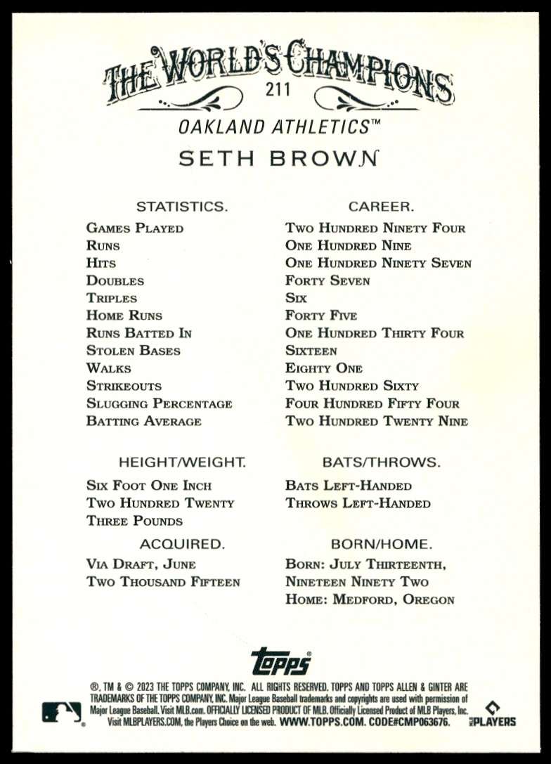 This Baseball card, from 2023 is part of the Topps Allen & Ginter card set. Seth Brown is featured and has a card number of 211.