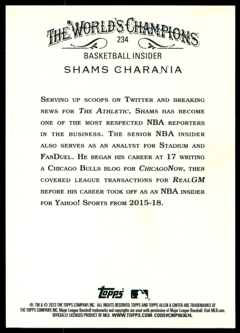 This Baseball card, from 2023 is part of the Topps Allen & Ginter card set. Shams Charania is featured and has a card number of 234.