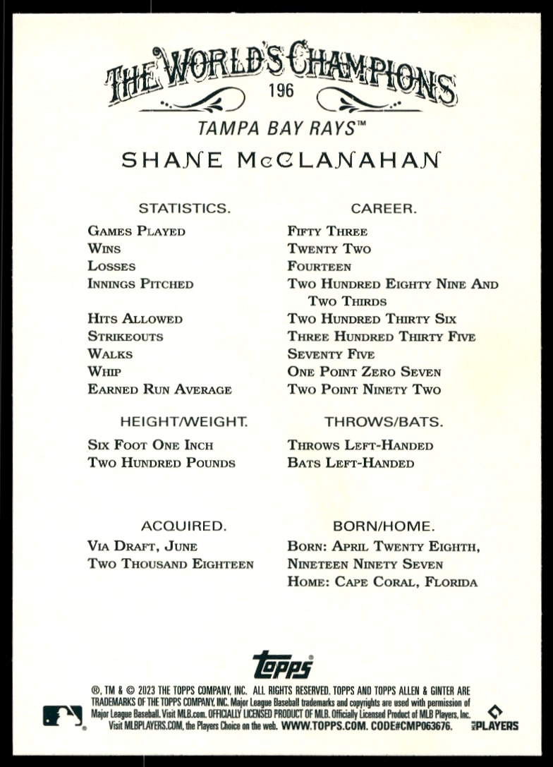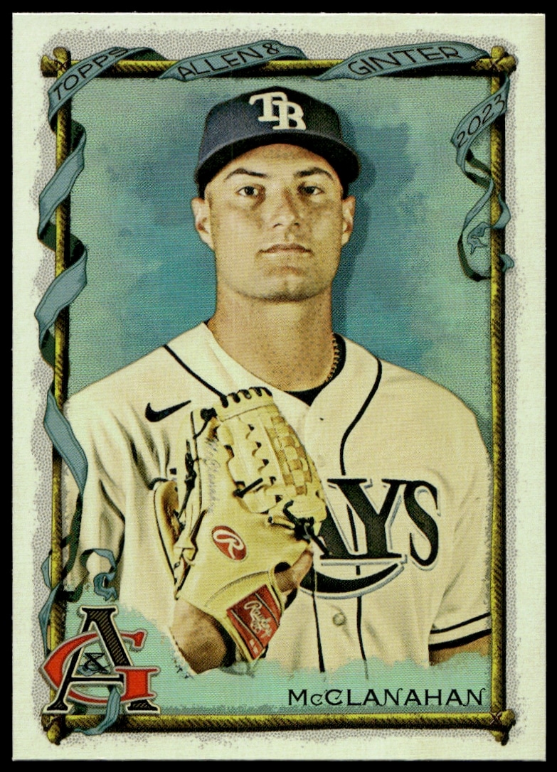This BaseballΒ card, from 2023 is part of the Topps Allen & GinterΒ card set. Shane McClanahan is featured and has a card number of 196.