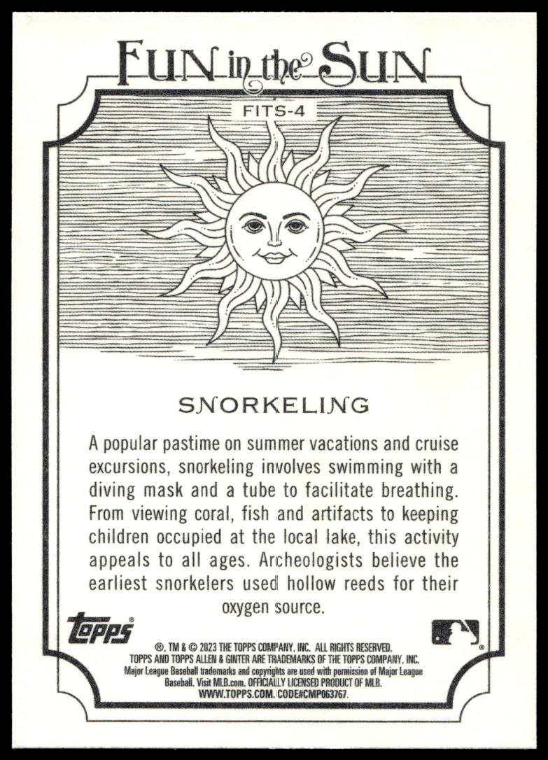 This Baseball card, from 2023 is part of the Topps Allen & Ginter card set. Snorkeling is featured and has a card number of FITS-4.