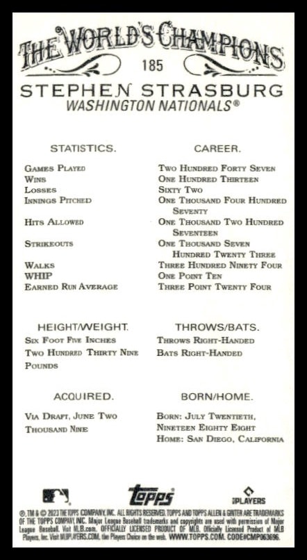 This Baseball card, from 2023 is part of the Topps Allen & Ginter card set. Stephen Strasburg is featured and has a card number of 185.
