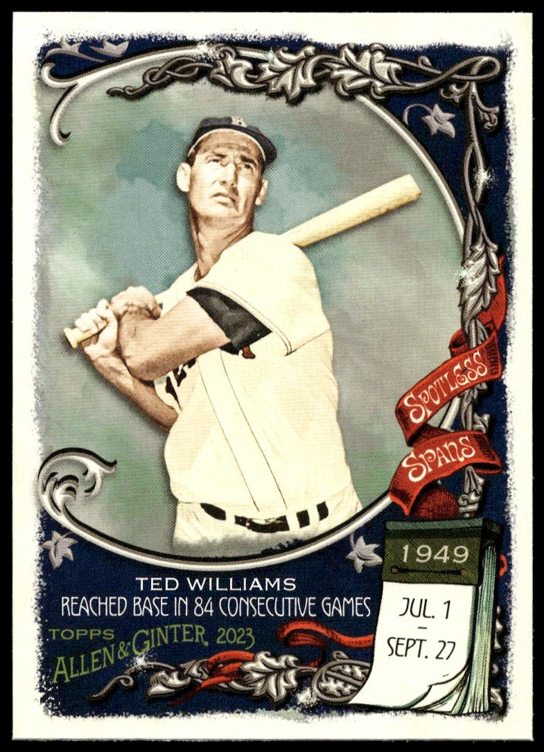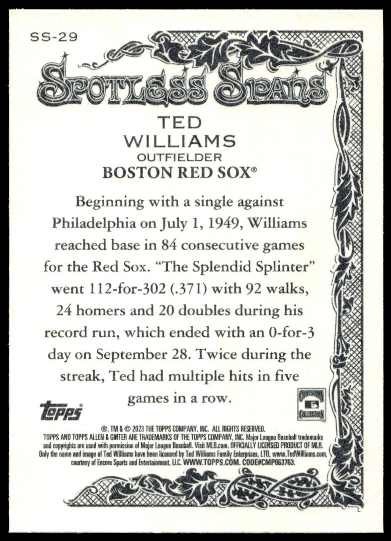 This Baseball card, from 2023 is part of the Topps Allen & Ginter card set. Ted Williams is featured and has a card number of SS-29.