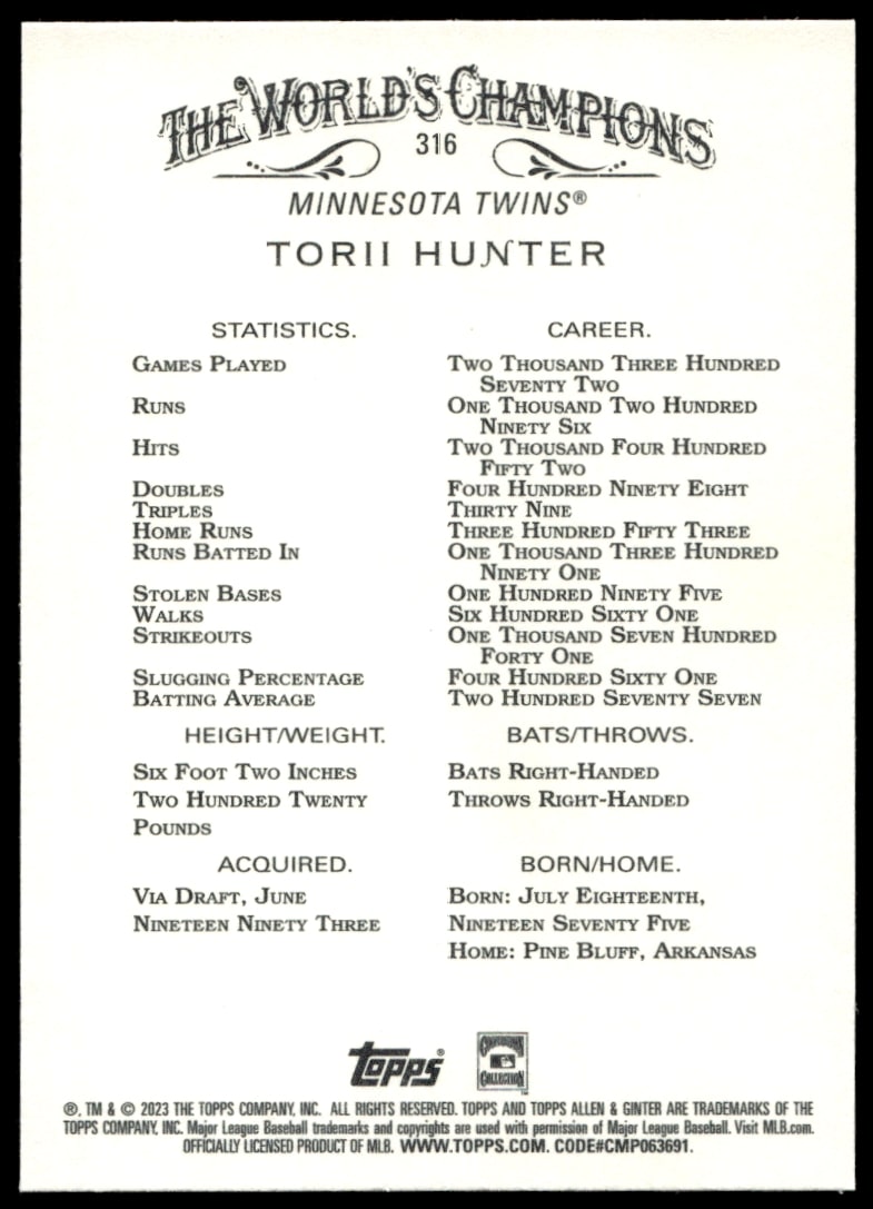This BaseballΒ card, from 2023 is part of the Topps Allen & GinterΒ card set. Torii Hunter is featured and has a card number of 316.