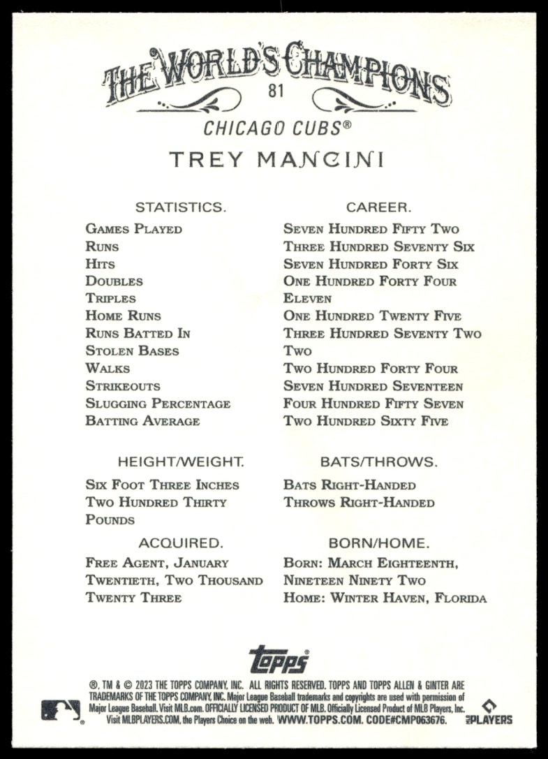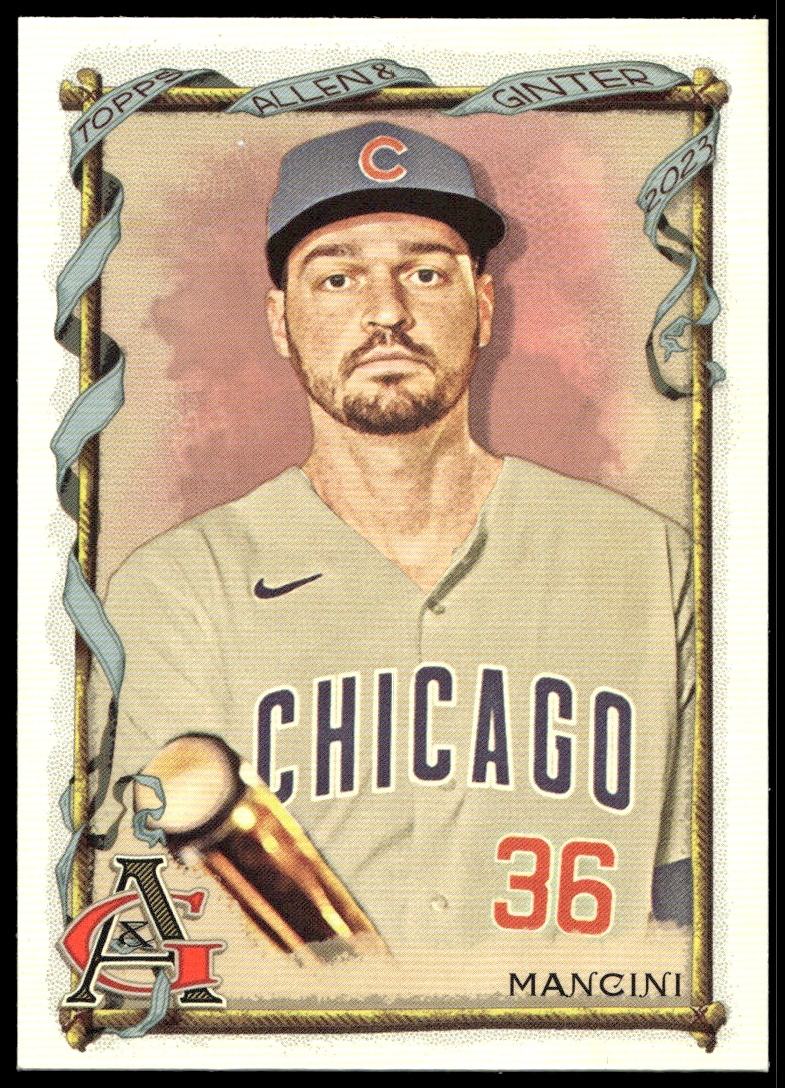 This BaseballΒ card, from 2023 is part of the Topps Allen & GinterΒ card set. Trey Mancini is featured and has a card number of 81.