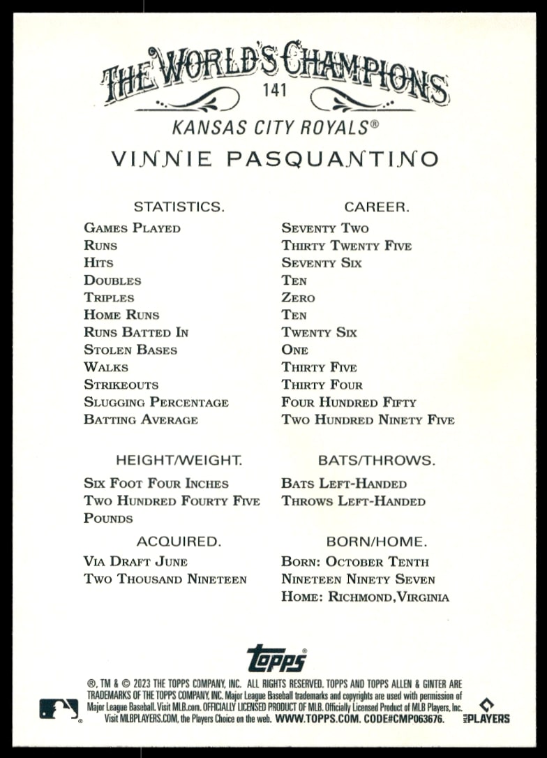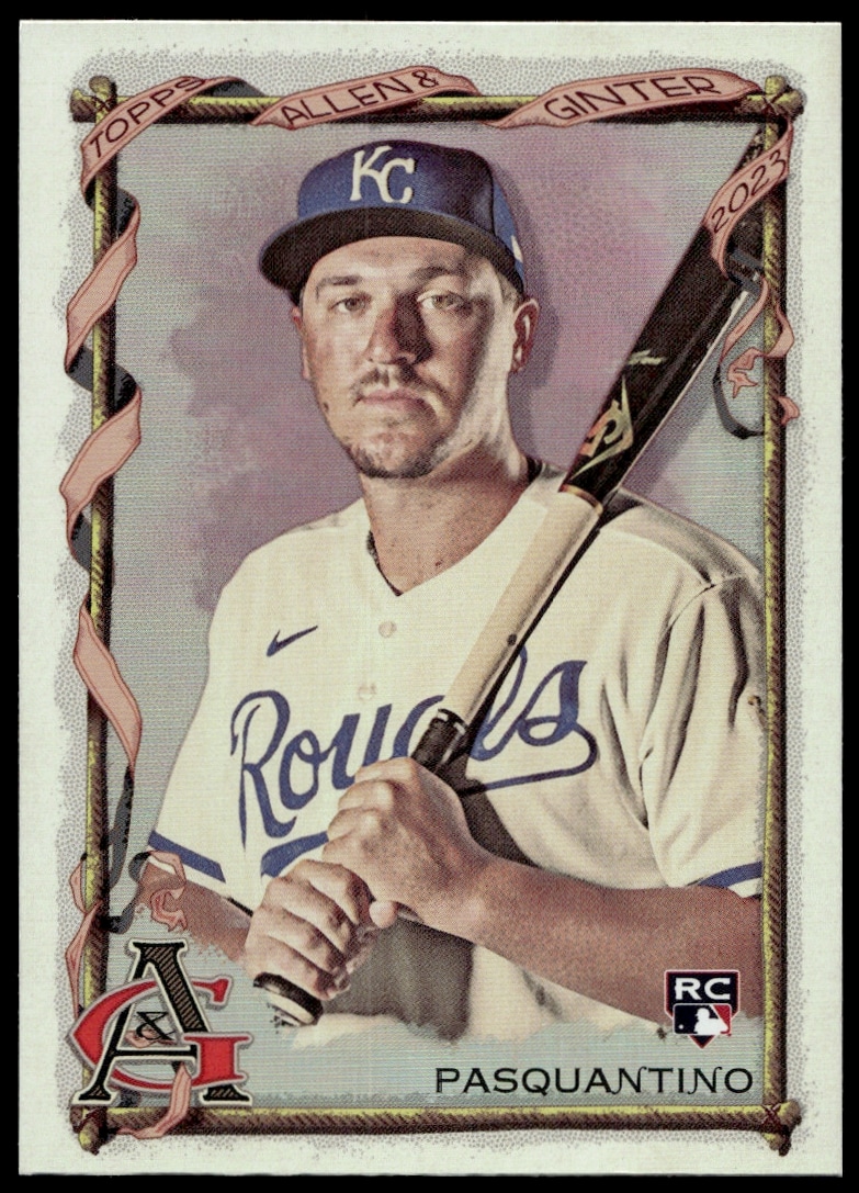 This Baseball card, from 2023 is part of the Topps Allen & Ginter card set. Vinnie Pasquantino is featured and has a card number of 141.