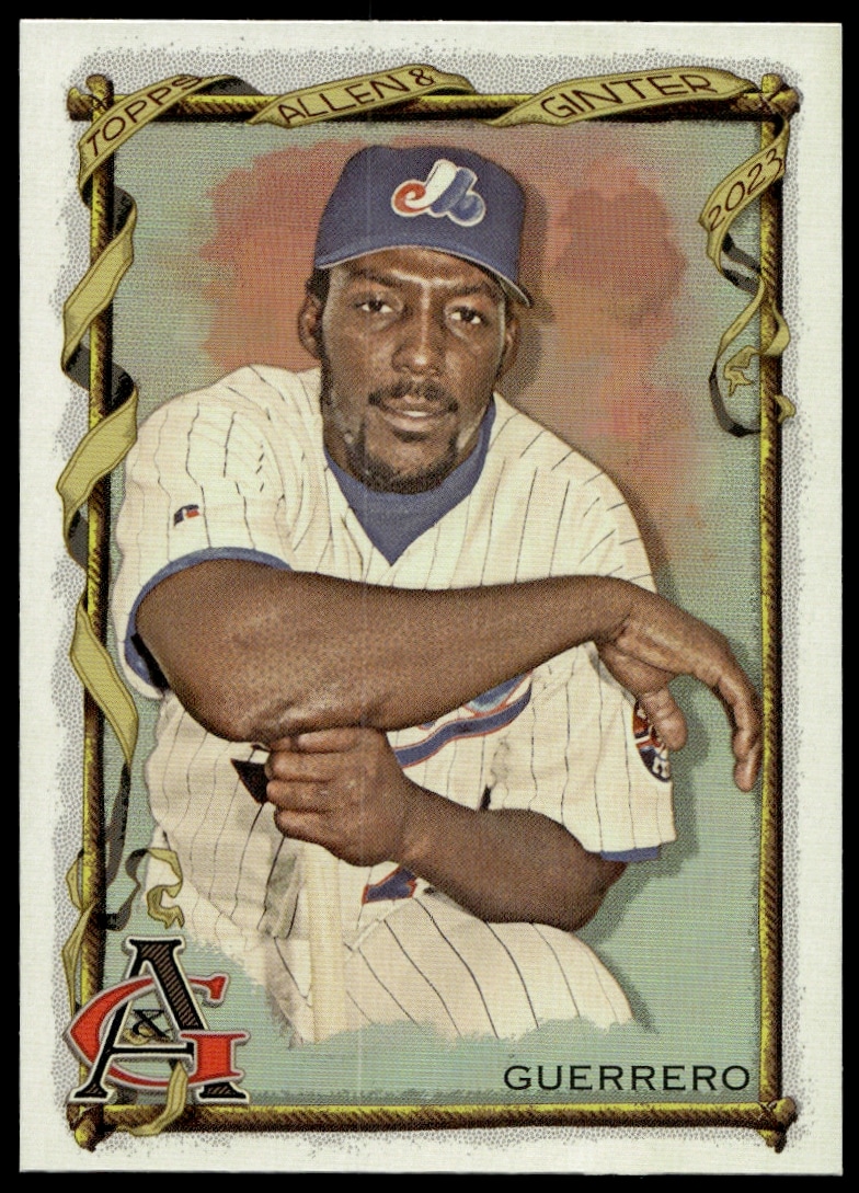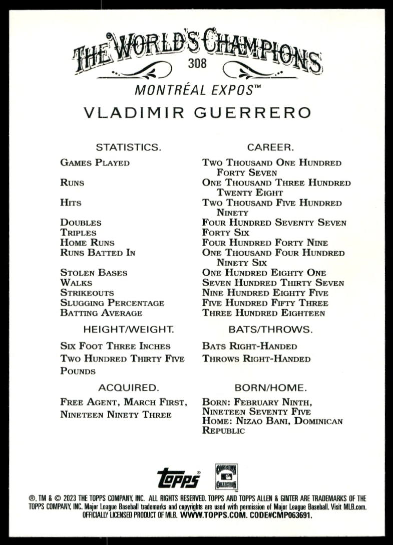 This BaseballΒ card, from 2023 is part of the Topps Allen & GinterΒ card set. Vladimir Guerrero is featured and has a card number of 308.