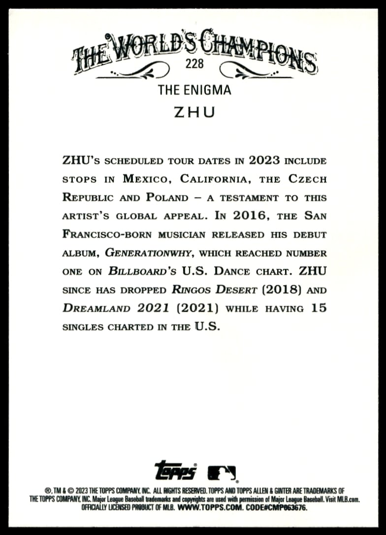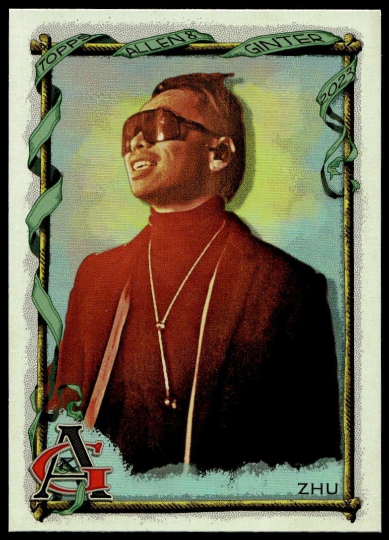 This Baseball card, from 2023 is part of the Topps Allen & Ginter card set. Zhu is featured and has a card number of 228.