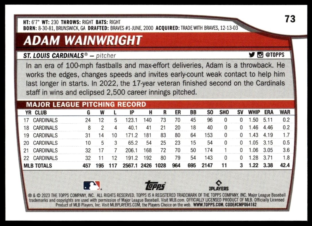 This Baseball card, from 2023 is part of the Topps Big League card set. Adam Wainwright is featured and has a card number of 73.