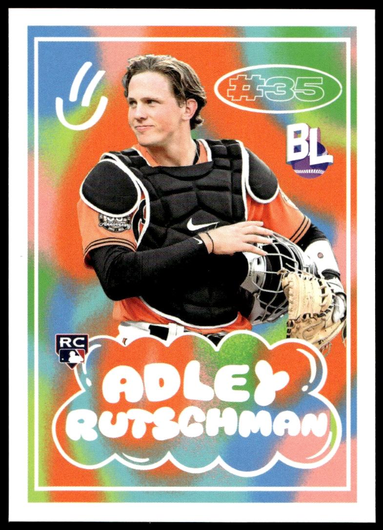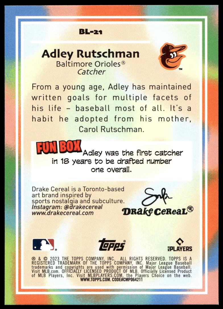 This Baseball card, from 2023 is part of the Topps Big League card set. Adley Rutschman is featured and has a card number of BL-21.