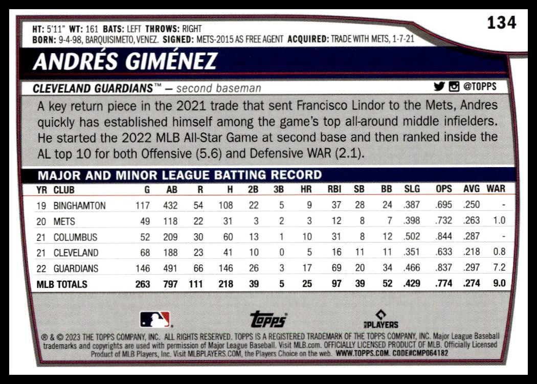 This Baseball card, from 2023 is part of the Topps Big League card set. Andrés Giménez is featured and has a card number of 134.
