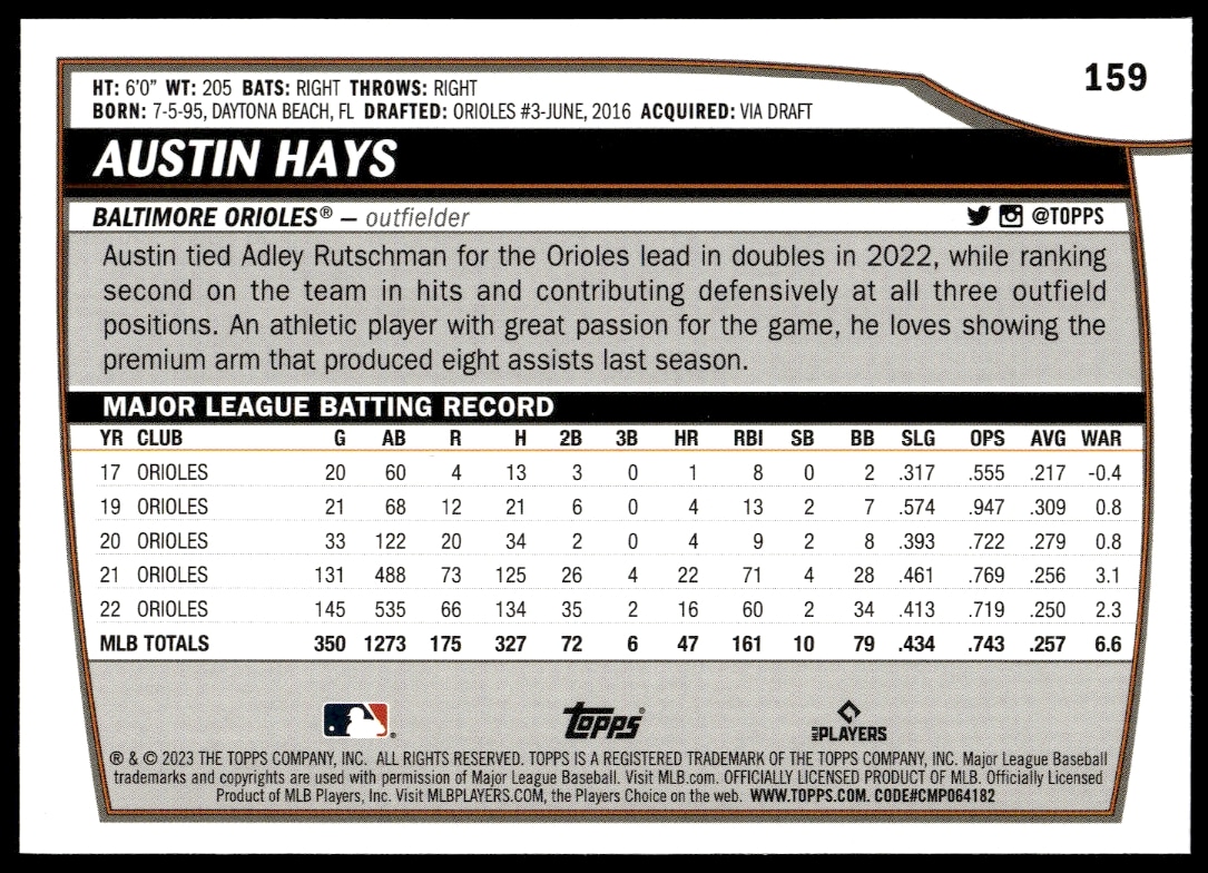This Baseball card, from 2023 is part of the Topps Big League card set. Austin Hays is featured and has a card number of 159.