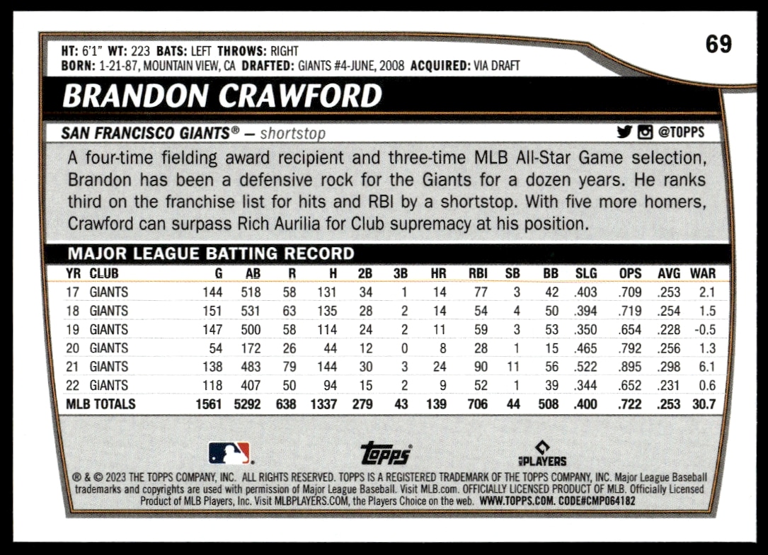 This Baseball card, from 2023 is part of the Topps Big League card set. Brandon Crawford is featured and has a card number of 69.