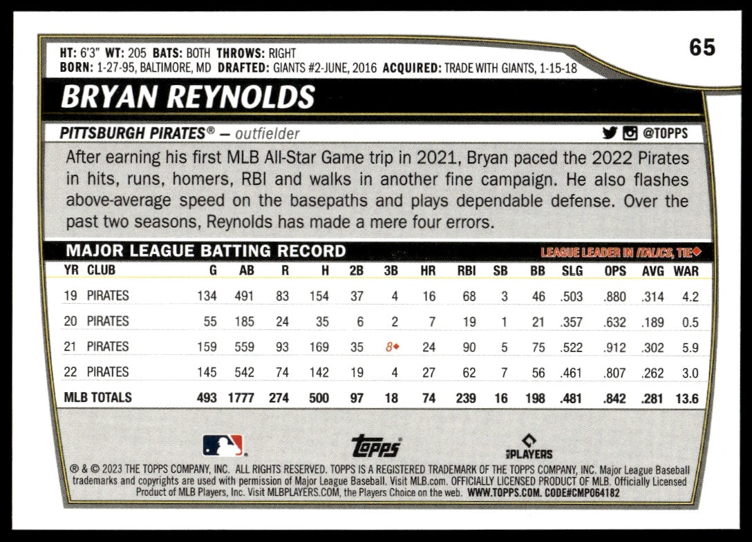 This Baseball card, from 2023 is part of the Topps Big League card set. Bryan Reynolds is featured and has a card number of 65.