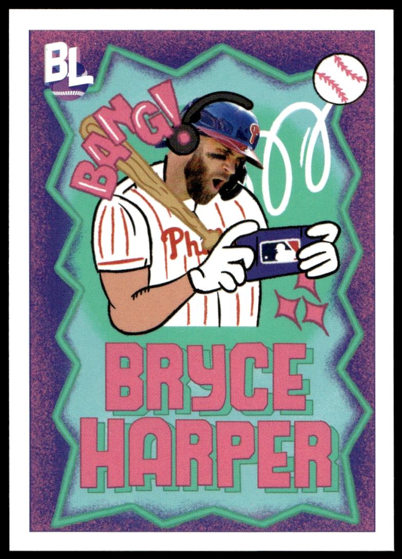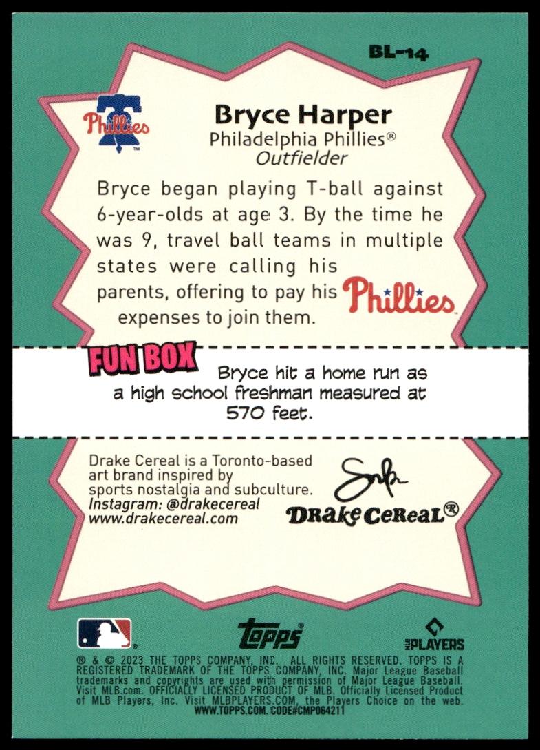 This BaseballΒ card, from 2023 is part of the Topps Big LeagueΒ card set. Bryce Harper is featured and has a card number of BL-14.