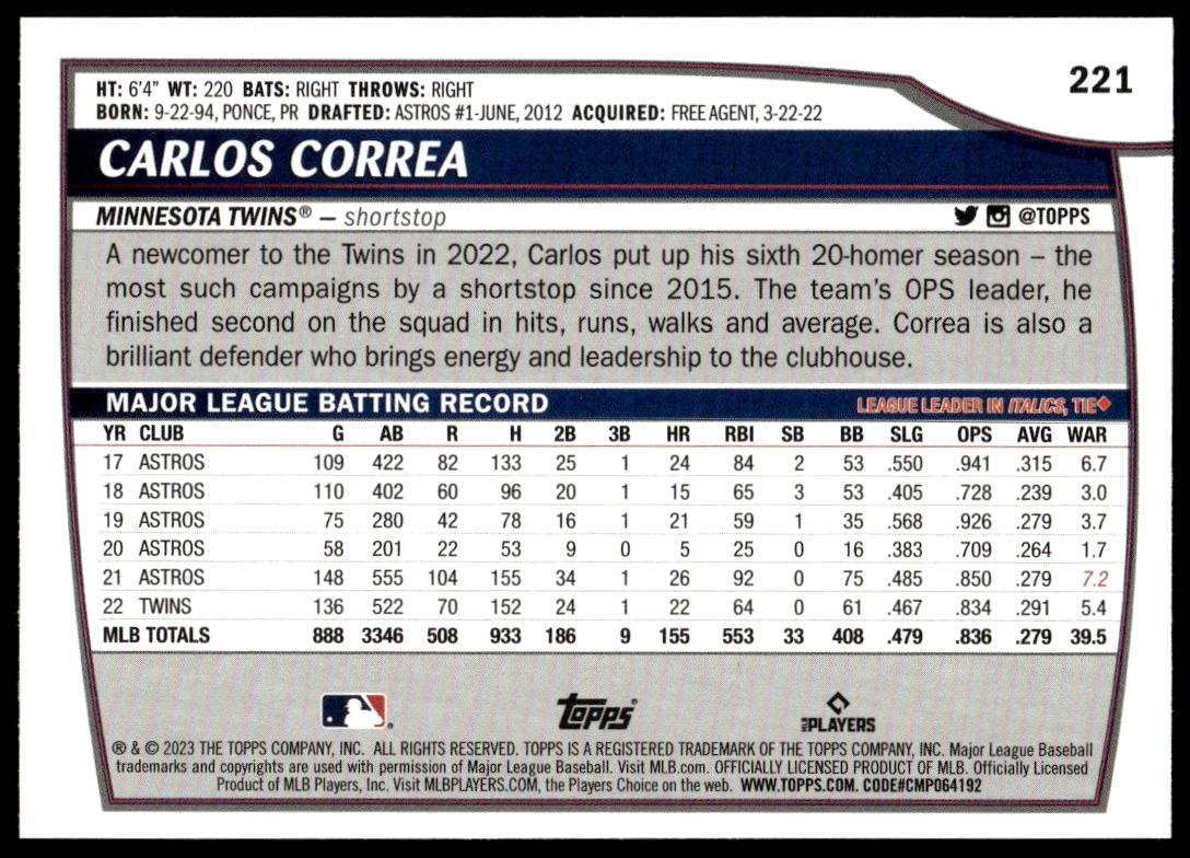 This BaseballΒ card, from 2023 is part of the Topps Big LeagueΒ card set. Carlos Correa is featured and has a card number of 221.