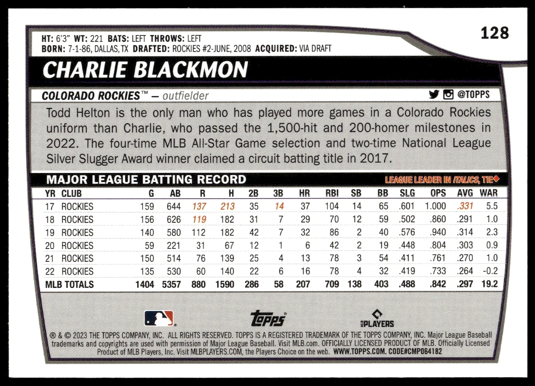 This Baseball card, from 2023 is part of the Topps Big League card set. Charlie Blackmon is featured and has a card number of 128.