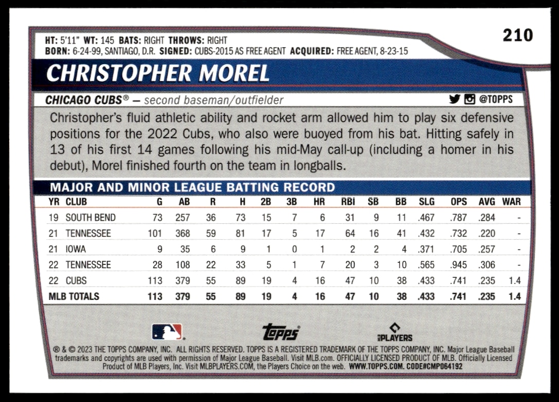 This Baseball card, from 2023 is part of the Topps Big League card set. Christopher Morel is featured and has a card number of 210.