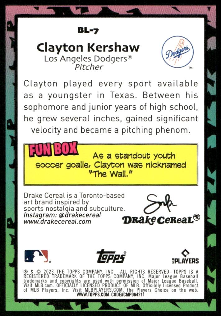 This BaseballΒ card, from 2023 is part of the Topps Big LeagueΒ card set. Clayton Kershaw is featured and has a card number of BL-7.