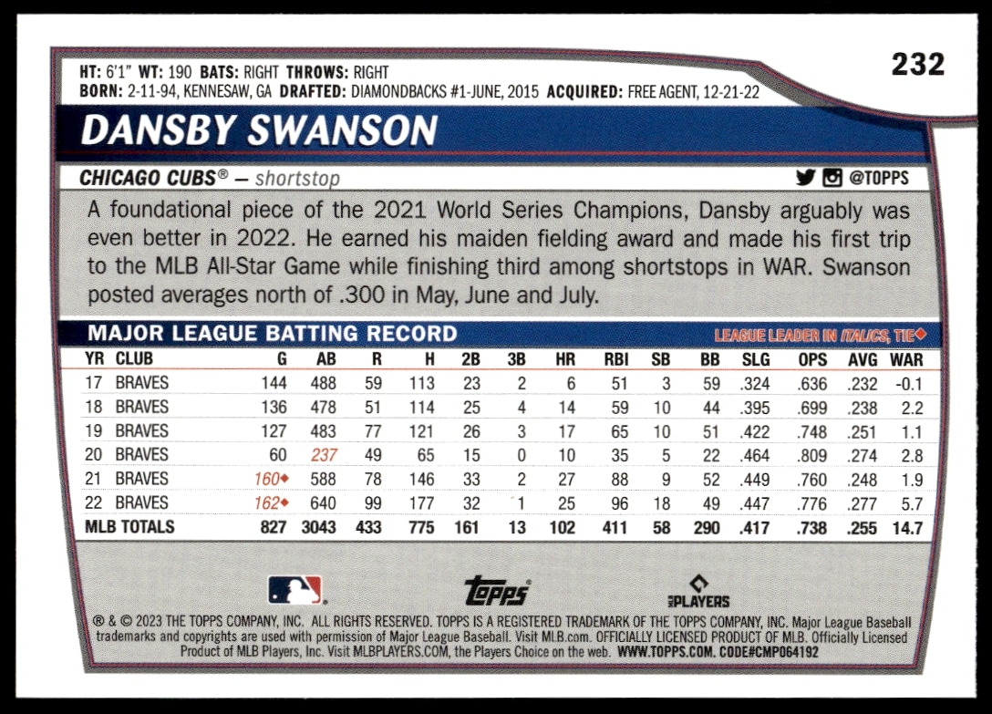This Baseball card, from 2023 is part of the Topps Big League card set. Dansby Swanson is featured and has a card number of 232.