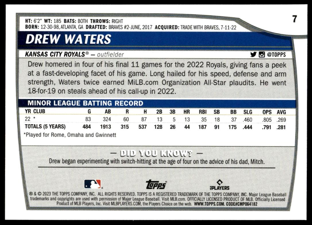 This Baseball card, from 2023 is part of the Topps Big League card set. Drew Waters is featured and has a card number of 7.