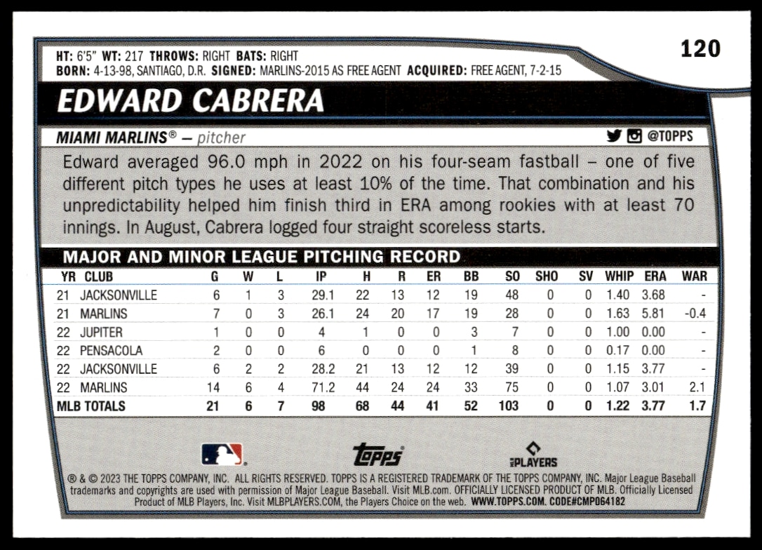 This Baseball card, from 2023 is part of the Topps Big League card set. Edward Cabrera is featured and has a card number of 120.