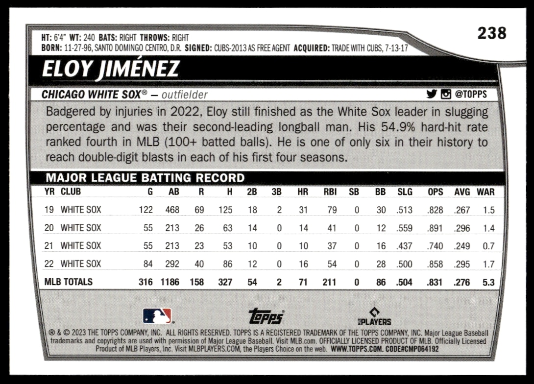 This BaseballΒ card, from 2023 is part of the Topps Big LeagueΒ card set. Eloy Jimenez is featured and has a card number of 238.