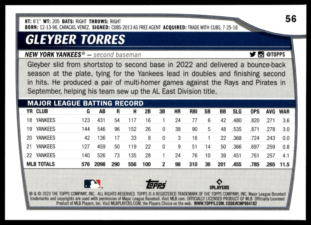 This Baseball card, from 2023 is part of the Topps Big League card set. Gleyber Torres is featured and has a card number of 56.