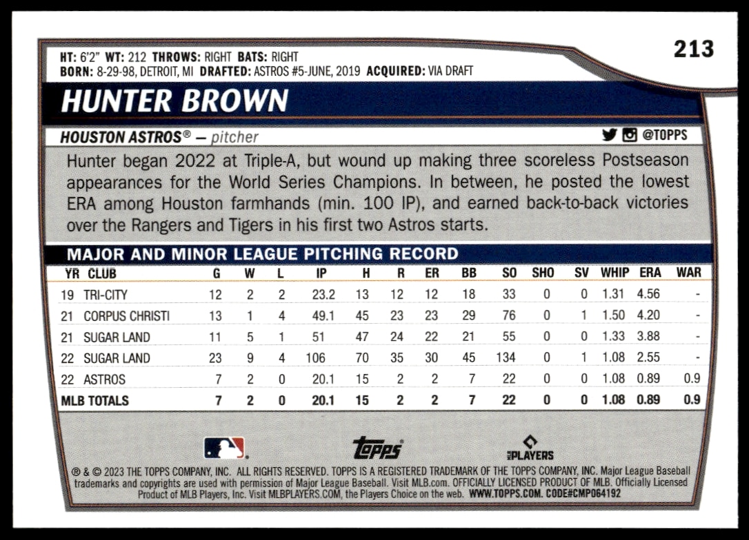 This Baseball card, from 2023 is part of the Topps Big League card set. Hunter Brown is featured and has a card number of 213.