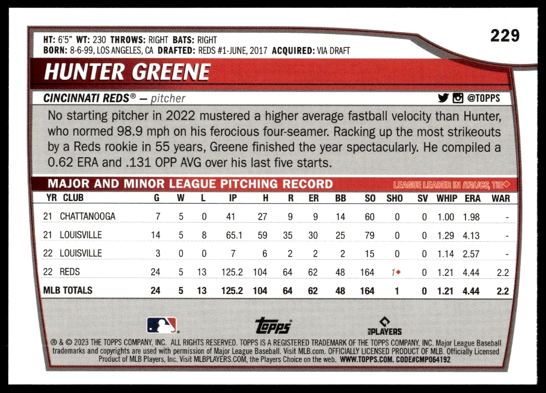 This Baseball card, from 2023 is part of the Topps Big League card set. Hunter Greene is featured and has a card number of 229.