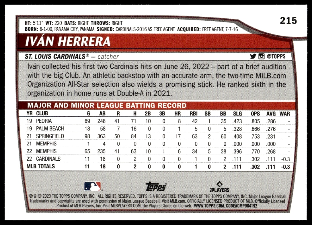 This Baseball card, from 2023 is part of the Topps Big League card set. Ivan Herrera is featured and has a card number of 215.