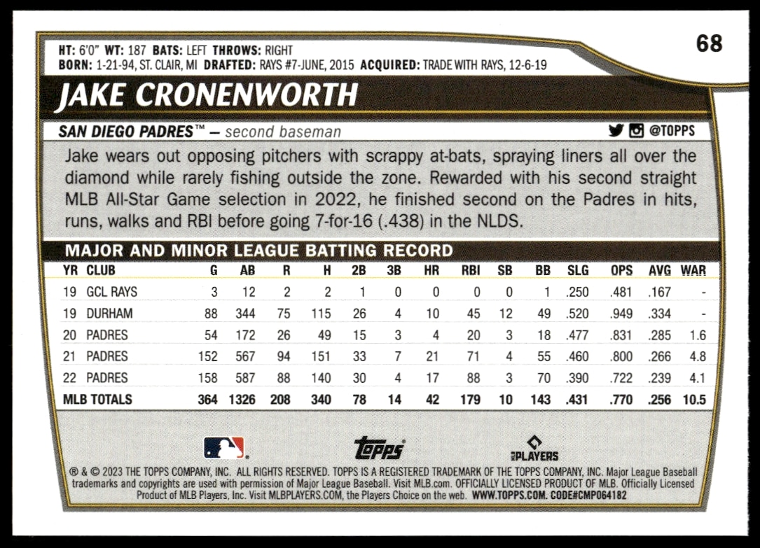 This Baseball card, from 2023 is part of the Topps Big League card set. Jake Cronenworth is featured and has a card number of 68.