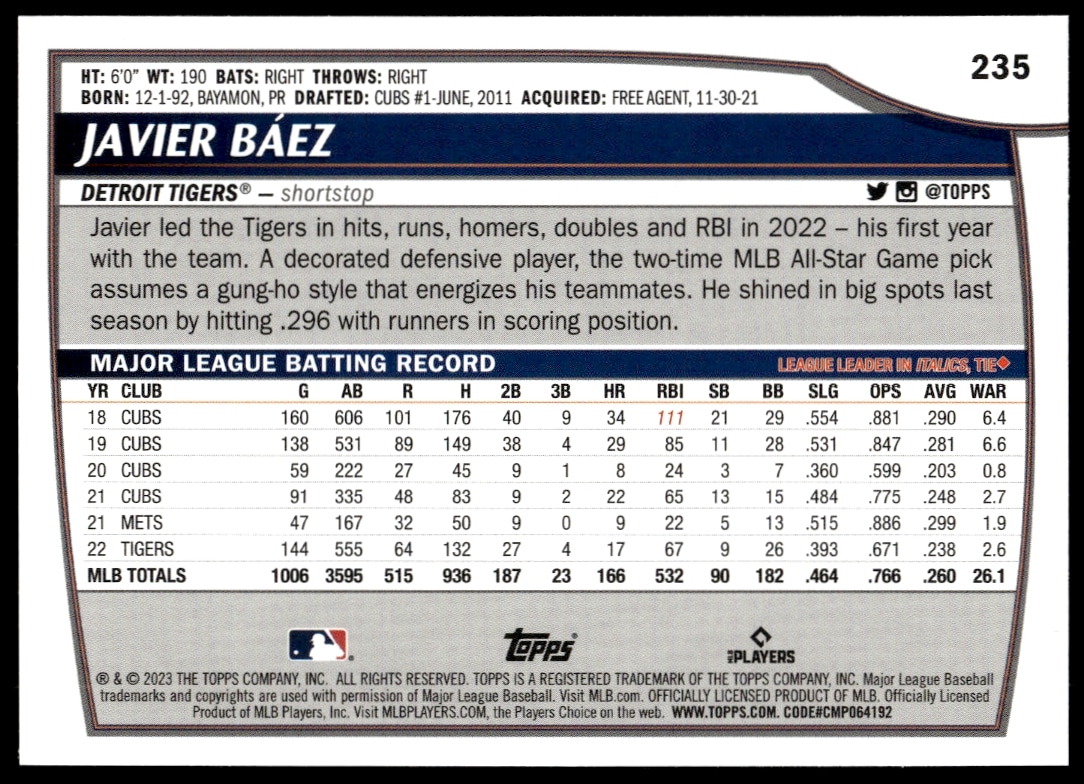 This Baseball card, from 2023 is part of the Topps Big League card set. Javier Baez is featured and has a card number of 235.